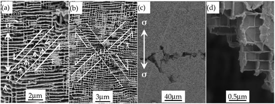 The morphology of crack initiation and propagation in the near fracture area of the alloy after creep at 800 °C/860 MPa for different times is shown in Figure 6. The direction of the applied stress is shown by the double arrows in Figure 6a,c. Figure 6a shows the microstructure of the alloy after 200 h of creep. It can be seen that the two γ′/γ phases are twisted at a fixed angle, as shown by the short white arrow in the figure. According to analysis, this is due to the start of the main slip trace line with a width of about 150 nm at a 45° angle relative to the stress axis, which leads to opposite stress on both sides of the slip band, as indicated in Figure 6a. As the creep proceeds, the secondary slip system starts, and as the primary/secondary slip system alternately start, microcracks are generated at the γ/γ′ two-phase interface at the intersection of the two slip systems, as shown in region H of Figure 6b.
