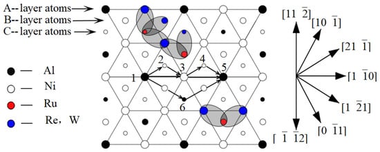 The mechanism of dislocation decomposition, producing different stacking faults, is shown in Figure 7. Thereinto, the black dots denote Al atoms, the white dots are Ni atoms, Re and W are represented by the blue dots, and Ru atoms are represented by the red dots. Ru in the γ′ phase mainly occupies the position of the face-centered cubic vertex, and Ru has strong adsorption properties, which allows heavy metal elements to attach to the vicinity of Ru atoms. Ru can hybridize with adsorbed atoms (Re and W), as indicated by the darker areas in the figure, and the darker colors indicate stronger bonding. The dots in the figure are divided into three types, those with large, medium, and small radii, which, respectively, represent the projection of the three-layer crystal plane atoms adjacent to the {111} plane on the (111) plane.