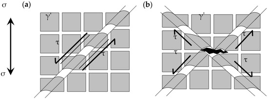 A schematic diagram of crack initiation and propagation is shown in Figure 8. At the later stage of creep, dislocations shear into the γ′ phase along the damaged dislocation network and begin to slip under the action of the maximum shear stress (τ), resulting in the start of the main slip system. Due to the opposite direction of the shear stress (τ) on both sides of the slip band, the rafted γ′ phase in the alloy is distorted along the direction of the main slip system, as shown in Figure 8a. As the creep proceeds, the secondary slip system starts in another orientation, causing the γ′ phase to twist again, as shown in Figure 8b. A large degree of plastic deformation occurs at the intersection of the two slip systems, and microcracks are generated, as shown in the black area in Figure 8b. The analysis shows that there are high concentrations of Re and Ru in the γ matrix of the alloy. These Re and Ru elements have strong binding forces. When the dislocations move to the vicinity of the Re and Ru clusters, they are “rebounded” back to the γ phase and continue to slip. After the dislocations encounter the Re and Ru clusters again, the “rebounding” occurs again, so the crack only initiates and expands in the γ matrix.