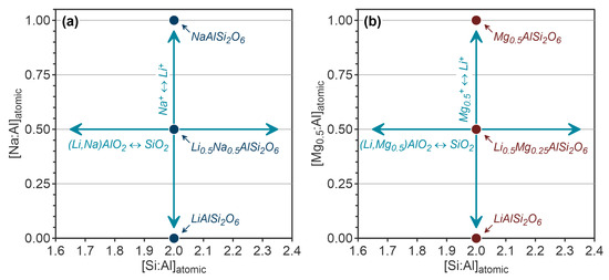 The compositional space and the main exchange vectors investigated in this study are visualized by expressing the phase chemistry in terms of atomic ratios of silicon, sodium, and half-magnesium (Mg0.5), all relative to aluminum (Figure 1). The silicon-to-aluminum ratio ([Si:Al]atomic) represents the extent of silica (SiO2) substitution for the alkali or alkaline earth aluminate (NaAlO2, Mg0.5AlO2), characteristic of stuffed silica derivatives. On the other hand, although the compositions are characterized by WDS-EPMA, where Li cannot be detected (Section 2.1.3), considering that the incorporation of a cation (e.g., Li1+, Na1+, Mg2+) within the silica derivatives is charge-balanced by Al3+ substituting for Si4+ in the tetrahedral framework [32], the efficiency of sodium or magnesium to exchange for lithium is equivalent to either the sodium over aluminum ([Na:Al]atomic) or, in the case of the magnesium system, the ratio of half the Mg relative to Al ([Mg0.5:Al]atomic), due to its divalent nature.