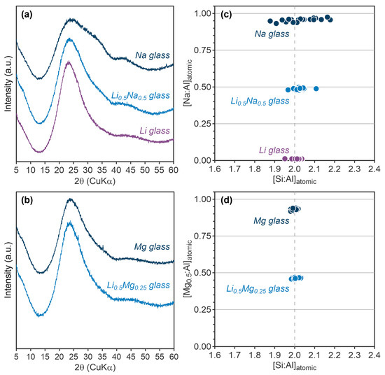 The XRD patterns shown in Figure 2a,b confirm that all synthesized glasses are fully amorphous with no identified crystalline phases. Their chemical compositions, as determined by WDS-EPMA (Figure 2c,d), are very close to the expected ideal stoichiometries displayed in Figure 1a,b. The level of homogeneity is within 2% relative, the only exception being the sodium endmember glass, where the [Si:Al]atomic ratio displays a wider variation of 8% relative (Figure 2c), likely related to a higher melt viscosity at peak temperature during the synthesis. Finally, considering that the starting material for synthesizing the lithium endmember glass was kunzite, which contains 0.15 wt% as Na2O, the [Na:Al]atomic ratio is actually slightly above 0 (0.01).