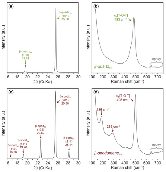 Powder-XRD patterns and Raman spectra collected on the synthesized Li-stuffed silica derivatives: (a,b) β-quartzss grown by thermal annealing of the lithium endmember glass; (c,d) β-spodumeness crystallized from a Na-doped LiAlSi2O6 melt.