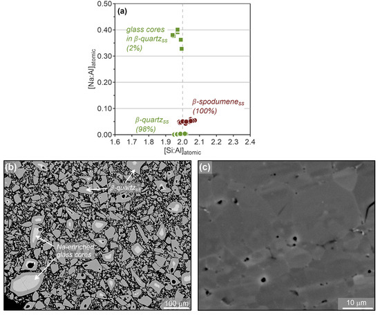 (a) Compositions and molar proportions (in brackets) of the phases produced during the synthesis of the starting Li-stuffed silica derivatives. (b) BSE image of the β-quartzss synthesis product emphasizing the minor residual glass cores accommodating the excess sodium from the kunzite precursor. (c) BSE image of the single-phase polycrystalline β-spodumeness synthesis product. The slight contrast reflects variation in the orientation of the crystals.