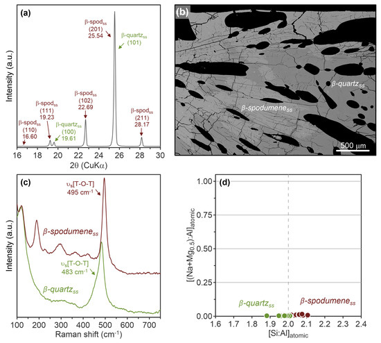 Characteristics of the starting material consisting of mm-sized fragments with coexisting crystals of β-spodumeness and β-quartzss. (a) Powder-XRD pattern collected on a ground portion of the material. (b) BSE image obtained on a polished section across a representative fragment. (c) Raman spectra acquired on β-quartzss and β-spodumeness crystals displaying low and high intensity, respectively, in the BSE image shown in (b). (d) Compositions of β-quartzss and β-spodumeness.