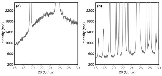 XRD patterns with extended intensity scales to better visualize the amorphous hump, which expresses the relative contribution of the residual glass phase within the recovered products from the solid-state crystallization experiments using the NaAlSi2O6 glass with (a) β-quartzss and (b) β-spodumeness endmembers. The indexed XRD patterns at full intensity can be found in Figure 6a and Figure 8a, respectively.