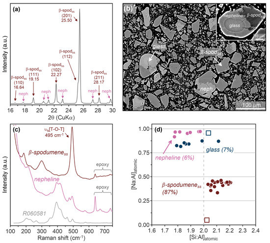 Characteristics of the product from the solid-state crystallization experiment performed using the NaAlSi2O6 glass and β-spodumeness endmembers. (a) Powder-XRD pattern collected on the ground portion of the recovered material. (b) BSE image obtained on a polished section across pellet fragments. The inset emphasizes the textural relationship of coexisting β-spodumeness, nepheline, and glass. (c) Raman spectra acquired on grains of β-spodumeness and nepheline. A reference spectrum of natural nepheline (Na0.66K0.27Ca0.04)AlSiO4 from the RRUFF database (R060581) is also shown for comparison. (d) Compositions (filled circles) and molar proportions (in brackets) of β-spodumeness, glass, and nepheline in the product. The empty squares represent the average compositions of β-spodumeness and glass before the heat treatment.