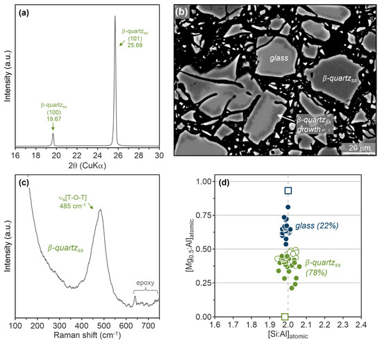 Characteristics of the product from the solid-state crystallization experiment performed using the Mg0.5AlSi2O6 glass and β-quartzss endmembers. (a) Powder-XRD pattern collected on the ground portion of the recovered material. (b) BSE image obtained on a polished section across pellet fragments. (c) Representative β-quartzss Raman spectra acquired on grains displaying low BSE intensity in (b). (d) Compositions (circles) and molar proportions (in brackets) of β-quartzss and glass in the product. The empty circles indicate analyses performed on the β-quartzss growth at the rim of the glass. The empty squares represent the average compositions of the corresponding phases before the heat treatment.