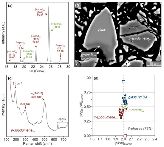 Characteristics of the product from the solid-state crystallization experiment performed using the Mg0.5AlSi2O6 glass and β-spodumeness endmembers. (a) Powder-XRD pattern collected on the ground portion of the recovered material. (b) BSE image obtained on a polished section across pellet fragments. (c) Raman spectra acquired on a representative β-spodumeness grain. (d) Compositions of β-spodumeness (red filled circles), β-quartz growth (green empty circles), and glass (blue filled circles) in the product. The molar proportions of glass and β phases (β-spodumeness and β-quartzss combined) are shown in brackets. The empty squares represent the average compositions of β-spodumeness (red) and glass (blue) before the heat treatment.