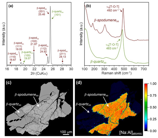 Characteristics of the product from the NaNO3 molten salt exchange experiment performed on synthetic fragments with coexisting crystals of β-spodumeness and β-quartzss. (a) Powder-XRD pattern collected on the ground portion of the recovered material. (b) Raman spectra acquired on β-quartzss and β-spodumeness crystals after exchange. (c) BSE image and (d) quantitative WDS-EPMA map of the [Na:Al]atomic ratio across an exchanged fragment.