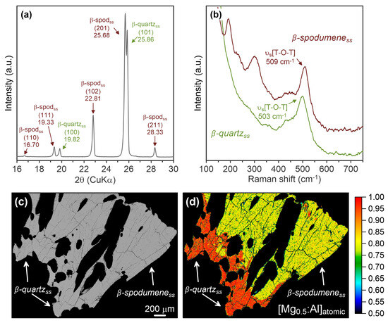 Characteristics of the product from the 0.6 MgCl2/0.4 KCl molten salt exchange experiment performed on synthetic fragments with coexisting crystals of β-spodumeness and β-quartzss. (a) Powder-XRD pattern collected on the ground portion of the recovered material. (b) Raman spectra acquired on β-quartzss and β-spodumeness crystals after exchange. (c) BSE image and (d) quantitative WDS-EPMA map of the [Mg0.5:Al]atomic ratio across an exchanged fragment.
