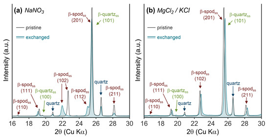 Comparison of the powder-XRD patterns collected on the decrepitated spodumene concentrate before (pristine) and after exchange in molten (a) NaNO3 and (b) 0.6 MgCl2/0.4 KCl. The peaks labeled “quartz” represent the contribution of the natural quartz mineral intergrown with α-spodumene in the concentrate.