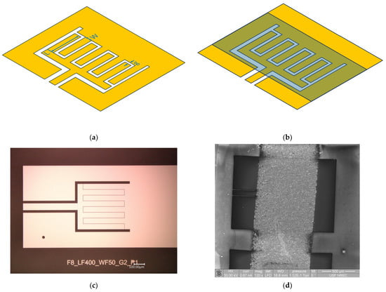 The initial designs of the fabricated devices were taken from [16] and were modified to better suit our fabrication process. The full layout design consisted of devices with four, six, eight, 10, and 14 interdigited fingers, each having a version with 2 μm, 5 μm, 10 μm, and 20 μm finger gaps and each exhibiting both one-port and two-port configurations. In this work, we present the measured results for the eight-finger one-port configuration, as depicted in Figure 1a,b, which has a finger length of L = 400 μm, a finger width of W = 50 μm, and a gap of g = 2 μm. This particular configuration was preferred for a number of reasons. First of all, the one-port configuration is not only easier to measure, but also allows for accurate extraction of the performance parameters. Second, the 2 μm gap is the smallest we could consistently fabricate with conventional lithography methods and, thus, provides the highest electric field under a certain level of applied bias voltage potential. Third, the eight-finger configuration is right in the middle of the range of designs, thus providing a measurement of the median capacitance and operating frequency range. As it can be seen in Figure 1c,d, the complete device consists of the IDC as well as a segment of coplanar waveguide (CPW) line, which serves as a landing pad for our ground–signal–ground (GSG) probes employed for the RF measurement. The CPW line was designed to be longer than its typical design as a compromise to allow for some degree of misalignment during the masking process, which is used during the BST deposition. The complete dimensions for the measured design can be found in Table 1.