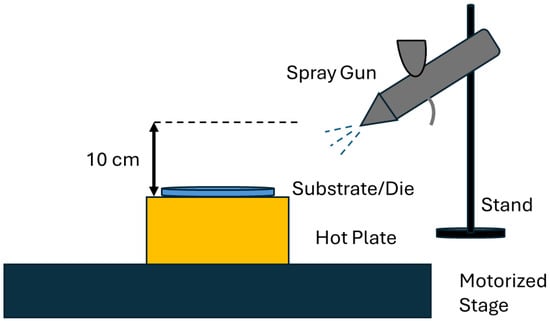The BST solution was purchased from TPL inc. and it consisted of 50 nm BST particles suspended in an ethylene glycol solution. The particles had a Ba0.5Sr0.5TiO3 stoichiometry and accounted for 49% of the weight of the solution. The solution was deposited using an ambient spray pyrolysis setup, as illustrated in Figure 2. As seen in the diagram, the die with the deposited electrodes was placed on top of a hot plate, which was mounted on a single axis motorized stage. The die was masked using the Kapton tape to cover the feedlines for probing, leaving only the main IDC finger area exposed for deposition, as seen in Figure 1b,d. Before deposition, the solution was placed in a centrifugal planetary mixer (ARE-310 Thinky Mixer) to break down any particle agglomerations and ensure homogeneity. It was then loaded into an Iwata HP-TH2 airbrush with a 0.06 mm nozzle connected to a commercial air compressor set to 35 psi and deposited on the IDC device die. The hot plate was maintained at a temperature of ~100 °C during deposition to begin the curing process and prevent overaccumulation of the liquid solution on the surface. To enhance the repeatability of the deposition process, the spray gun was kept at an approximate angle of 30° and at a height of 10 cm from the hot plate surface, the controller for the stage was set to a speed of 20 mm/s with an acceleration and deceleration of 80 mm/s2, and the die passed below the spray region a total of ten times, with five passes in each direction to improve the uniformity of deposition. This process consistently yielded films with a thickness of approximately 18 μm and an average roughness of 2.5 µm. After deposition, the die was left on the hot plate for 2 min to promote the evaporation of most of the solvent before being put into a vacuum oven at 100 °C for 2 h to ensure that any trapped moisture and residual solvent evaporated. Initial attempts to fully cure the films with only the hot plate showed an increased likelihood of surface cracking and delamination of the films due to the rapid and uneven heating, while the sample was under a partially liquid state and occasionally still retained trapped moisture.