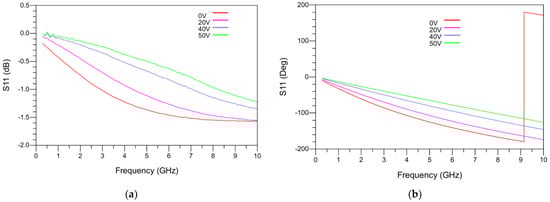 (a) Magnitude of the reflection coefficient (S11) of the BST IDC device under a varied bias voltage (0–50 V), and (b) phase of the reflection coefficient of the BST IDC device under a varied bias voltage (0–50 V).