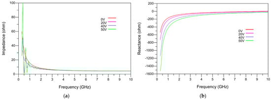 Figure 4a,b show the real and imaginary parts of the calculated Z11 parameters, respectively. Based on Equation (4), as the bias voltage increased, the capacitance decreased, leading to a larger negative reactance, which can be observed in Figure 4b. As also shown in Figure 4a, when the bias voltage increased, the series impedance decreased to the lower frequency region. This can be explained most likely by a greater contribution of the dielectric losses to the equivalent series resistance (ESR) of the BST varactor device at a lower frequency. At higher frequencies, the resistance contribution from the metallization layer dominated. One can also observe from Figure 4a,b that the effect of the noisy response in Figure 3a at low frequencies for the 40 V and 50 V measurements can be seen prominently in the extracted impedance, but the reactance was only minimally affected.