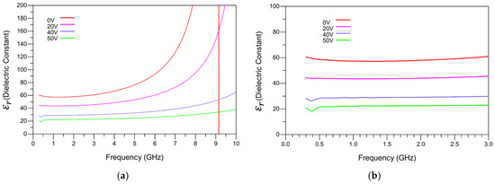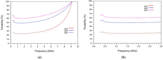 Figure 5a,b present the tunability as a function of bias voltage plotted over different frequency ranges. As it is shown, at each bias voltage, the tunability remained quasi-constant within the low-frequency range, after which the tunability level in terms of percentages started to rapidly change due to the effects of the resonance. At 1 GHz, with a bias voltage of 50 V, which is equivalent to an electric field of 25 kV/mm, a maximum tunability of about 60% was observed, and, even at a relatively low electric field of 7.5 kV/mm, a tunability of about 18% was demonstrated.