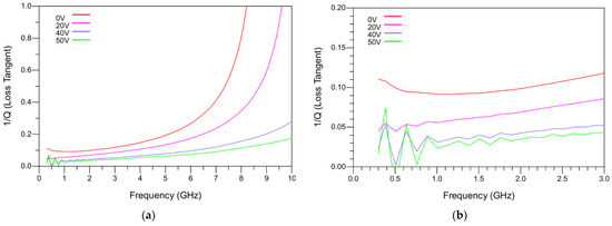 The loss tangent, as seen in Figure 8a,b, was found to decrease as the applied bias voltage increased, which is consistent with the behavior presented by Muzzupapa et al. [33]. The loss tangent remained below 0.15 throughout the frequency range up to 3 GHz under a 0 V bias and below 0.05 under a 50 V bias, as observed in Figure 8b. We expected this to be the case because of the inverse relationship between the loss tangent (1/Q) and Q. A summary of all key characterization parameters of the BST IDC device at 1 GHz can be found in Table 2, and a comparison with other works can be found in Table 3.