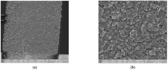 The SEM images shown in Figure 9a–d were taken from the BST film on the measured IDC device. Figure 9a shows the entire IDC device, depicting the BST film completely covering the IDC finger region as well as the slight misalignment offset during deposition as a result of the Kapton masking tape placement. As shown in Figure 9b–d, the as-deposited BST nanoparticles agglomerated into clusters, which were then sintered via photonic thermal processing. While the individual nanoparticles were originally 50 nm, the average size of the sintered crystals was observed to be roughly 500 nm.