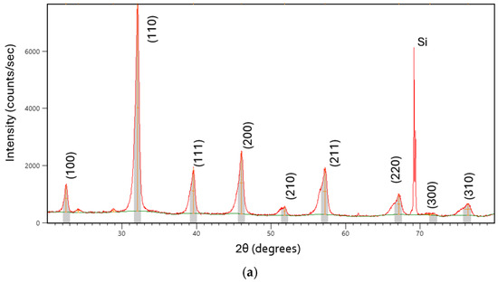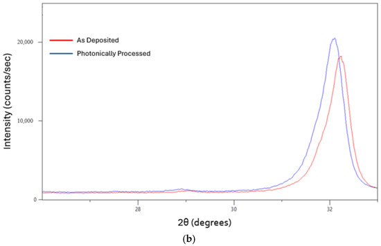 The results of the two-theta scan of the thermally processed film, as seen in Figure 10a, show that all the Ba0.5Sr0.5TiO3 crystal orientations were present with a clear preference for the (110) orientation. All peaks corresponding to the BST and to the Si wafer were analyzed with X’pert HighScore and labeled accordingly, with the small unlabeled peaks belonging to the Kβ radiation. The comparison of the (110) peak between the as-deposited film and the film after the thermal processing in Figure 10b shows that the peak slightly shifted to a lower angle and its intensity increased after thermal processing, suggesting an induced change in the lattice parameter. The XRD peak of the as-deposited film slightly shifted to the right from the BST (110) peak, a phenomenon which suggests residual compressive stress [38]. This residual stress was released as the peak for the thermally annealed sample returned to the anticipated peak position after the photonic thermal processing. From this, it can be inferred that stress relaxation occurred.