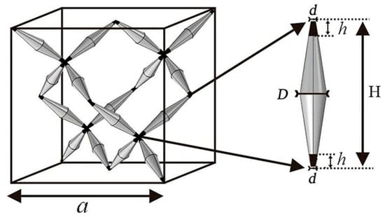 In this paper, a composite PM (CPM) structure based on the PM structure proposed by Kadic [28] is considered to study its effect on the band structure in the thermal environment. The CPM structure is composed of 16 double-cone elements, each pair of cones being interconnected by a wide diameter D to constitute a double-cone unit. The double-cone units are interconnected by contacts at their narrow diameters d, forming a face-centered cubic structure with lattice constant a, as illustrated in Figure 1. The height of a double-cone unit can be expressed as H = 3 a / 4 . In this paper, the structural parameters are fixed as a = 37.3 mm, D = 3 mm, d = 0.55 mm, and h = 0.04H. The PM structure consists of two different materials: aluminum (gray area) and silicone rubber (black area). The material parameters used in this paper are shown in Table 1. Since aluminum is a temperature-dependent material, its parametric model can be expressed as [29]: