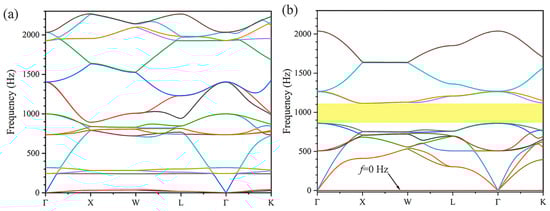The band structure of the PM at 40 °C was calculated, as illustrated in Figure 2b. For comparison, the PM at room temperature (i.e., 20 °C, with no temperature field applied) was also calculated, as demonstrated in Figure 2a. Only the first 20 orders of dispersion curves are plotted. It is observed that at room temperature, only the single-mode frequency region of the PM exists and there is no complete acoustic bandgap that can suppress all acoustic wave transmission. As illustrated in Figure 2b, the band structure of the PM is relatively compressed in the thermal environment compared to the room environment. In addition, a complete acoustic bandgap (light yellow region) is obtained in the frequency range from 861.9 to 1113.0 Hz, in which all acoustic waves can be isolated. Thus, by varying the temperature, it has not only the single-mode bandgap characteristics but also the low-frequency ABG properties of locally resonant phononic crystals. In the range of single-mode bandgaps, the PM has fluid properties. In thermal environments, all acoustic waves cannot be transmitted over the complete ABG, and the PM has acoustic isolation properties.