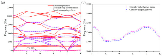 Then, the reasons why the PM obtains a complete acoustic bandgap in the thermal environment were analyzed. For elastic structures, each part of the elastomer in the thermal environment generally expands with increasing temperature. In addition, the thermal environment can change the material properties of the structure and can also cause thermal deformation of the structure, resulting in thermal stresses. Therefore, the effect of combined thermal stress and temperature-dependent material properties on the band structure of the PM was explored. The band structure was investigated separately for three different cases, i.e., at room temperature, considering only thermal stresses, and the coupling effect of thermal stresses with temperature-dependent material, as shown in Figure 3. The band structure of PM at 40 °C is very different from that at room temperature. It is clear from the figure that a complete acoustic bandgap appears when only thermal stresses are considered. Moreover, the influence of coupling effects slightly reduces the frequency values compared to considering only thermal stress effects, as shown in Figure 3b. However, the coupling is of limited significance, probably due to the small change in the elastic modulus of aluminum as the temperature rises to 40 °C. Therefore, thermal stress plays a major role in influencing the band structure as a key factor in the generation of bandgaps when temperature is not too high.