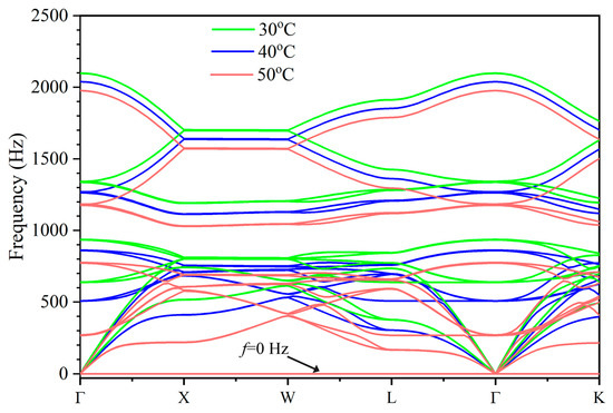 Figure 5 illustrates the band structure of the PM subjected to thermal stress at different temperatures, and the three colored curves in the figure are the band structures in different thermal environments. It can be easily seen that there is a complete acoustic bandgap in the band structure, and all the band curves show a downward trend with increasing temperature. According to the stress distribution in Figure 4, the normal thermal stress is negative, while the shear thermal stress has not only positive but also negative values, but its magnitude is much smaller than the normal thermal stress. This will reduce the stiffness of the PM structure, causing the band curve to shift towards low frequencies. The bandgap frequency range varied from 935.9–1190.3 Hz (30 °C) to 775.7–1027.4 Hz at 50 °C. Thus, thermal stresses can modulate the ABG.