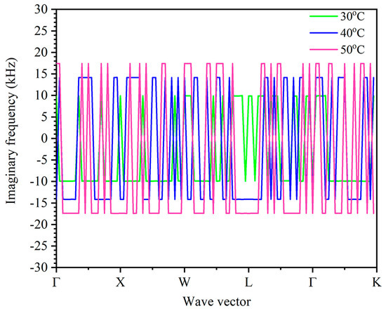 It is noteworthy that in Figure 2b, Figure 3a and Figure 5, zero-frequency bands appear in the low-frequency bands as thermal stress is applied. This is because the structural stiffness of the PM is less than the additional negative thermal stress stiffness under the wave vector condition in the central Brillouin zone, resulting in the stiffness matrix becoming indefinite. In addition, the corresponding imaginary frequencies also appear in the zero-frequency bands. Figure 6 depicts the band structure of the imaginary frequency and real wave number at different temperatures. As the temperature increases, the amplitude of the imaginary frequency increases. Usually free-wave transmission is considered only when the wave vector is real, and the occurrence of imaginary frequencies may be related to the attenuation of free fluctuations [30]. In addition, reference [31] shows that a larger imaginary frequency amplitude implies a larger free fluctuation attenuation and narrower bandgap, which is consistent with the research conclusion of this paper.