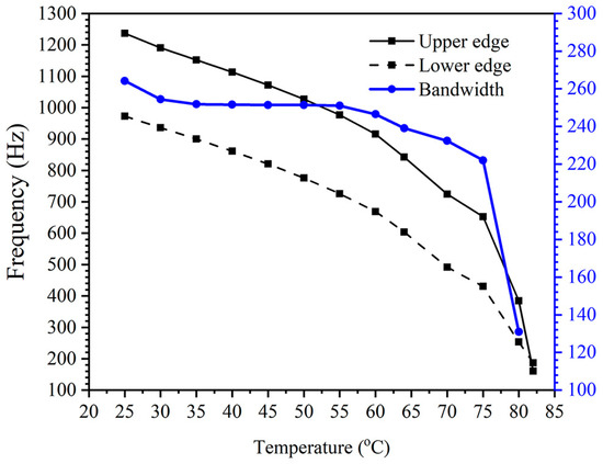 Then, the thermal environment effect on the ABG characteristics of PM was investigated. Figure 7 displays the variation in the ABG with temperature. The calculations show that both the upper and lower bound frequencies of the ABG drift to lower frequencies as temperature increases. The frequency range of the bandgap decreases from 972.6 Hz–1236.8 Hz to 253.5 Hz–384.4 Hz as the temperature increases from 25 °C to 80 °C.