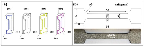 (a) Schematic diagram of the four secondary orientations of 5°, 37°, 47°, and 57°, sampled on the ingot; (b) geometry of the tension sample with the location for the EBSD scans indicated by the box.
