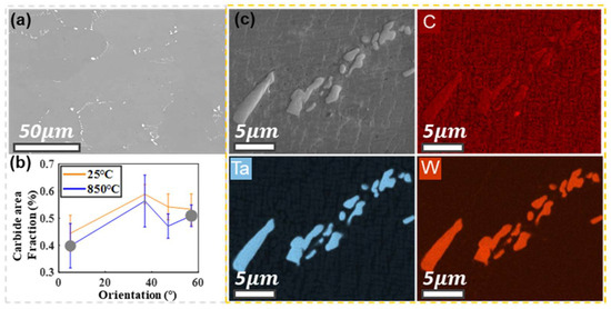 Microstructures of the alloy: (a) SEM image; (b) the carbide area fraction varies with different secondary orientations; (c) EDS images indicating the carbide compositions.