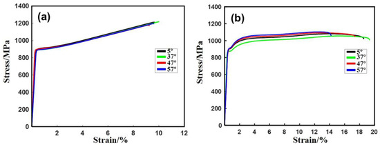 True stress–strain curves for different secondary orientations at (a) RT and (b) 850 °C.
