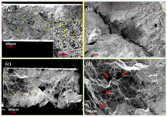 The fracture surfaces at different temperatures are displayed in Figure 4. On the fracture surface at RT (Figure 4a,b), there are some precipitate particles resting inside the micro-voids, indicating that those precipitate particles contributed to the micro-void nucleation and growth (indicated by the yellow arrows in the inset of Figure 4a). A significant number of casting voids were also observable in Figure 4a (indicated by the green arrows). In certain regions depicted in Figure 4a, the fracture surface exhibits a smooth texture devoid of river-like patterns or dimples; furthermore, micro-cracks and instances of crack bifurcation are discernible; these features indicate characteristics of a brittle fracture. In addition, some cracks were initiated at the location of large-sized precipitates (indicated by the white arrows in Figure 4b), which extended to the matrix during subsequent tensile loading. Therefore, the main type of fracture at room temperature is a brittle fracture, but the micro-dimples induced by carbides provide certain plasticity to the alloy.