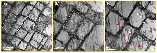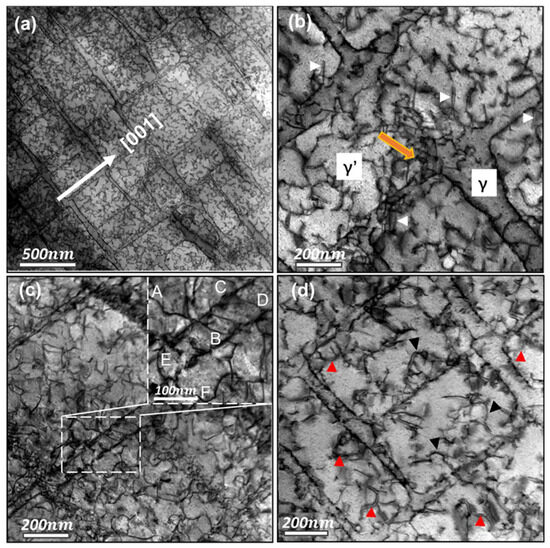 Based on the experimental results, Figure 5 depicts the complete structural defects observed at room temperature. Since the higher intrinsic strength of γ′, plastic deformation primarily occurs in the γ channels and results in local dislocation multiplications. The confined dislocation multiplication together with the higher RT shear strength of the γ′ phase resulted in pronounced work hardening as shown in Figure 3a. Stacking faults are usually difficult to observe in the γ channels attributed to the high density of dislocations [27]. With the applied stress further increased, some dislocations are able to shear into the γ′ phase in the form of partial dislocation pairs.