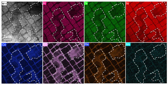 The bright-field TEM images of the deformed microstructure after tensile fracture at room temperature are shown in Figure 5. At first sight, high density dislocations are tangled in the narrow γ matrix, and some dislocation pairs sheared into the γ′ precipitates along the <110> directions (indicated by the red triangles in Figure 5c). Occasionally, some γ′ demonstrated elevated dislocation punch-in and entanglement, as highlighted by the white dashed boxes in Figure 5a,b. More frequently, stacking faults are found in the γ′ phase (marked white triangle in Figure 5c). The chemical compositions in the dislocation-enriched γ′ were analyzed by scanning transmission electron microscopy (STEM) and the corresponding energy dispersive x-ray spectroscopy (EDS) elemental mapping (at.%) is shown in Figure 6. Interestingly, the heterogeneously deformed regions where dislocations shear into the γ′ precipitates (in the white dashed boxes) exhibit significant enrichments in Co, Cr, and Re, which are the γ stabilizing elements. In contrast, Al and Ta, which are the γ′ stabilizers, are depleted in those regions.