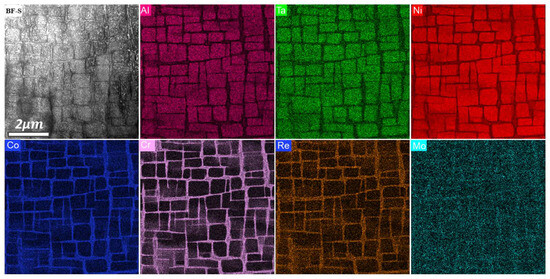 The composition of the region where dislocations sheared into γ′ was also analyzed by STEM and the corresponding EDS elemental mapping (at.%) is shown in Figure 8. It seems that the element distribution is more homogeneous in the sample tested at the HT. The Co, Cr, and Re preferential segregation into some of the γ′ phases, as observed in the RT test, is absent at the HT.