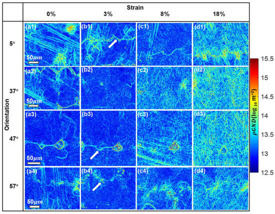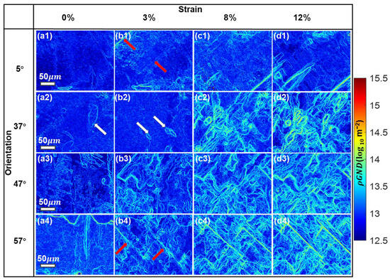 As illustrated in Figure 9(a1–a4), the GND density () started low before loading. Around yielding at ~3% strain (Figure 9(b1–b4)), the 47° and 57° orientations accumulated higher dislocation densities compared to the other two orientations. When the strain reached 8% (Figure 9(c1–c4)), the dislocation accumulation on the 37° sample started to catch up. The features of slip bands were not clearly observed in the GND density maps because dislocations in the slip bands are theoretically not “geometrically necessary”, meaning they do not induce lattice rotations apart from a relative lattice shift. A few slip trace features can be observed on the maps and are indicated by the red arrows in Figure 9(b1,b4). Those features are better named “shear bands” rather than slip bands, as the interactions between multiple dislocation types within those bands gives rise to local lattice curvature, hence the observed GND hot spots. A few cases of GND density concentration were observed around the precipitates, as indicated by the white arrows in Figure 9(a2,b2). The overall strain accumulation for the 5° orientation sample was not as significant as those of the other orientations as indicated by the lack of dislocation cell build-up evidenced in Figure 9(d1) compared to Figure 9(d2–d4). Moreover, the rectangular-shaped dislocation cells possibly indicate that the cell formation at RT is primarily influenced by the deformation within the γ channel.