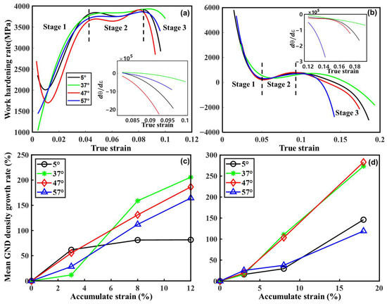(a,b) The work hardening rate variations among secondary orientations at (a) RT and (b) 850 °C. (c,d) indicate the evolution of the GND density growth rate vs. strain for different secondary orientations at (c) RT and (d) 850 °C.
