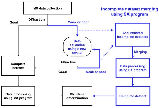 In MX data collection, when the diffraction intensity of a single crystal is good, complete diffraction data can be collected and processed using an MX program, which can then be used for structure determination (Figure 1). However, when the diffraction intensity of the single crystal is weak or poor, it becomes impossible to collect a complete dataset with the desired completeness and resolution. In such cases, new crystal samples are typically used to collect X-ray diffraction studies again. When a complete dataset is not obtained during diffraction data collection, incomplete datasets accumulate (Figure 1). By merging these incomplete datasets, a complete dataset can be generated, enabling the determination of the crystal structure (Figure 1). Theoretically, using SX programs, incomplete datasets can be processed and merged into a single complete dataset.