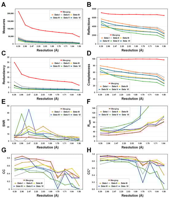 The profile of the data processing statistics of the merged and incomplete (Data I–VI) TsaBgl datasets. (A) Measures. (B) Reflections. (C) Redundancy. (D) Completeness. (E) SNR. (F) Rsplit. (G) CC. (H) CC*.