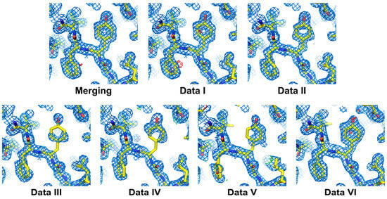 The statistics of the merged dataset were analyzed by comparing the data collection statistics and refinement statistics of the complete merged data with those of the incomplete Data I–VI (Figure 2). The theoretically possible number of total reflections at 1.55 Å resolution was 67,880. Merging data involves processing more images than the incomplete datasets and, therefore, containing information on a greater number of diffraction features, such as Bragg peaks, along with higher redundancy (Figure 2A–C). In addition, the number of reflections in the merged dataset was 67,418, which was 1.57–2.44 times higher than that in different incomplete datasets (Figure 2B). The completeness of Data I–VI was lower than 62.93 (45.32), whereas that of the merged data was 99.32 (97.28), indicating that the completeness was significantly improved by merging using CrystFEL (Figure 2D). Other statistical values, such as redundancy, CC, CC*, and Rsplit for the merged dataset, were improved in all processed resolution regions by merging Data I–VI, meeting the general standards in MX (Figure 2E–G). In contrast, the SNR of the merged data in all the resolution regions was lower than that of Data I–VI, indicating that SNR was not improved by the merging of the incomplete datasets (Figure 2H).