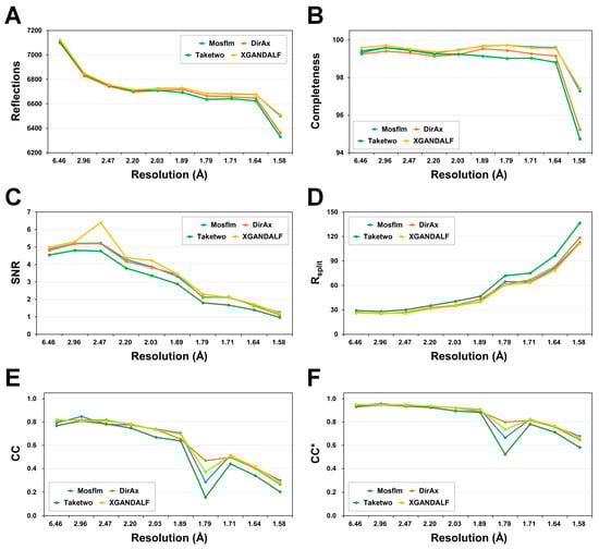 The profile of the data processing statistics of the merged TsaBgl datasets processed by MOSFLM, DirAx, Taketwo, and XGANDALF. (A) Reflections. (B) Completeness. (C) SNR. (D) Rsplit. (E) CC and (F) CC*.