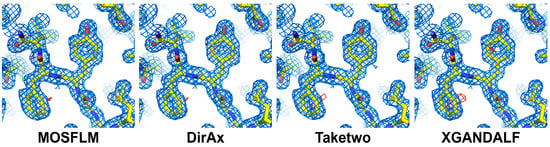 2Fo-Fc (marine mesh: 1.2σ) and Fo-Fc (green mesh: +3σ; red mesh: −3σ) electron density maps of the merged TsaBgl dataset processed by MOSFLM, DirAx, Taketwo, and XGANDALF.