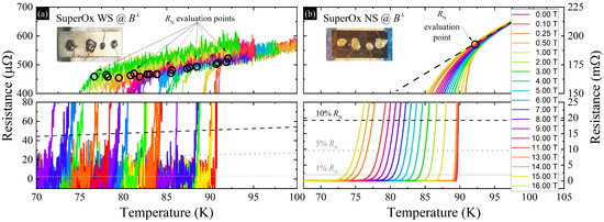Figure 3 shows a selection of the curves for SuNAM, SST, and SuperOx tapes, obtained under varying applied magnetic fields, with the applied magnetic field parallel and perpendicular to the surface of the coated conductor. The results demonstrated that the resistive transition broadens with increasing magnetic field strength in both orientations and shows the anisotropic behavior in the resistive transition. It is worth to recall that SuNAM and SST samples have a metallic stabilization layer on top of the superconducting layer, as in the case of SuperOx WS. Thus, also for SuNAM and SST samples, the onset of the superconducting transition is shifted towards lower temperature as the applied magnetic field increases. Thus, for both SuNAM and SST tapes, is estimated for each set curve. In contrast, for the SuperOx NS sample, we estimate from the zero-field data as reported previously (Figure 1b).