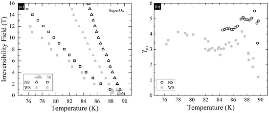 Once defined the criteria to estimate the normal state resistance in the two different cases of a sample with a metallic layer on top of the superconducting one and the case of a sample without a metallic cap, we proceeded to evaluate the irreversibility field at different temperature values. To ensure our data remained safely above the noise level, we adopted a 10% criterion of the normal state resistance. Since in the SuperOx WS case lines fell well within the noise level, while the line given by the 5% criterion is too close to the noise band (see lower panel of Figure 1a). We opted for a 10% criterion for all the samples for sake of estimation uniformity; that is, we estimated at also for the piece SuperOx NS. At this point, it is worth nothing that the presence of the metallic stabilization layer on top of the superconducting layer, as in the case of SuperOx WS, causes a sensible decrease in normal state resistance compared with that of a bare sample such as SuperOx NS. As a result, the same criterion corresponds to actual different threshold values. Anyway, it can be seen in Figure 2a that the curves obtained for SuperOx NS and SuperOx WS with the 10% criterion follow the same behavior. Further confirmation comes from the comparison of the anisotropy factor behaviors. Given that is defined as the ratio between and , in Figure 2b it is shown that the curves for SuperOx NS and SuperOx WS show similar features. From these results, we can conclude that the presence of a metallic cap does not alter the general behavior of the physical parameters, which are estimated well below the superconducting transition middle point. Thus, in the following, for sake of simplicity, we will refer only to the SuperOx NS piece, which represents a sample in between a coated conductor and the reference thin film.