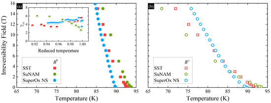 From data reported in Figure 3b, the resulting behaviors for SuNAM and SuperOx NS are evaluated and reported in Figure 4, together with the SST CCs data presented in our recent work [41]. In particular, we can observe the temperature dependence of the irreversibility field anisotropy parameter . This is an important parameter to be considered, since a too high value (>10) typical of highly anisotropic materials such as BiSCCO requires special attention when designing devices in which the orientation of the magnetic field with respect to the tape cannot be fixed along the whole conductor (e.g., magnets for particle accelerators) [24,27]. Once data are reported as a function of the reduced temperature , with being the critical temperature evaluated at 50% of for each curve, the three tapes show not that different behaviors. In particular, in the case of SST, the anisotropy is almost constant around a value of 4 with just a slight increase near , while for SuNAM and for SuperOx it is almost constant for , but with higher values. Anyway, the values of are always well below the typical values for high anisotropic superconductors for all three tapes, which can be then defined as moderately anisotropic CCs.