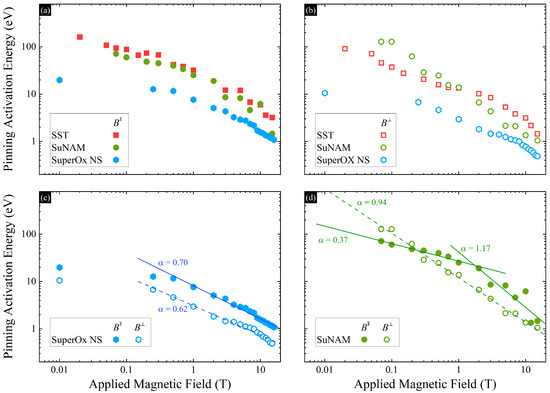 Flux pinning energy as function of magnetic field applied parallel (a) and perpendicular (b) to the CCs surface for all samples under investigation. SST data are extracted from [41]. The fitting curves with the specific values obtained for SuperOx and SuNAM samples are displayed in the panels (c,d), respectively.