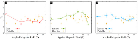 A more detailed comparison among all three tapes can be performed by looking at this flux pinning energy anisotropy by introducing an additional parameter, defined as that is plotted in Figure 6, together with the same parameter evaluated for a plain YBCO film. In this case, the three samples show slightly different behaviors. Figure 6a shows the behavior for the SST sample; it can be seen that at high field (>5 T), the anisotropy value oscillates around a value of 2. A similar behavior is observed for sample SuperOx, but with a oscillating around a slightly higher value (Figure 6c). It is worth mentioning that in SuNAM tape, a larger variation of the anisotropy can be expected due to the unexpected crossing occurring between the and the , as shown in Figure 5. Indeed, for SuNAM tape, first increases from 2 to 3 as the field approaches about 5 T, suddenly decreasing to about 1.5 at higher magnetic fields. Looking at the variations in of the different tapes with respect to that of the YBCO plain film, it can be noted that in the case of the tapes, trends that are different from the increasing trend of the plain film are shown. Although the trends for the tapes are not pronounced, it can be drawn that regardless of the nature of Artificial Pinning Centers, i.e., customized or naturally grown, they affect the anisotropy of the pinning landscape in a way that, by increasing the applied magnetic field, a decrease of the value can be achieved. Thus, there is still room for improving performance by reducing pinning anisotropy by means of proper engineering of APC in the tapes.