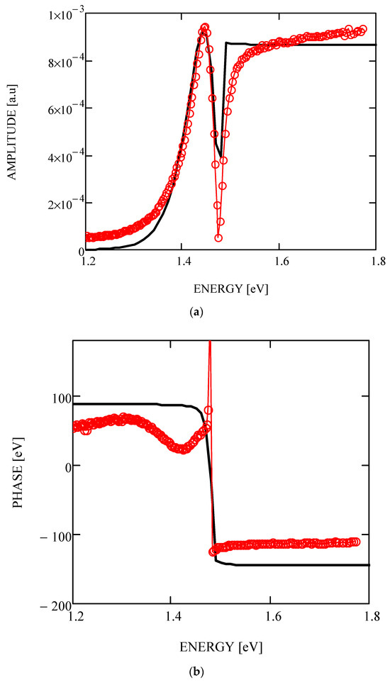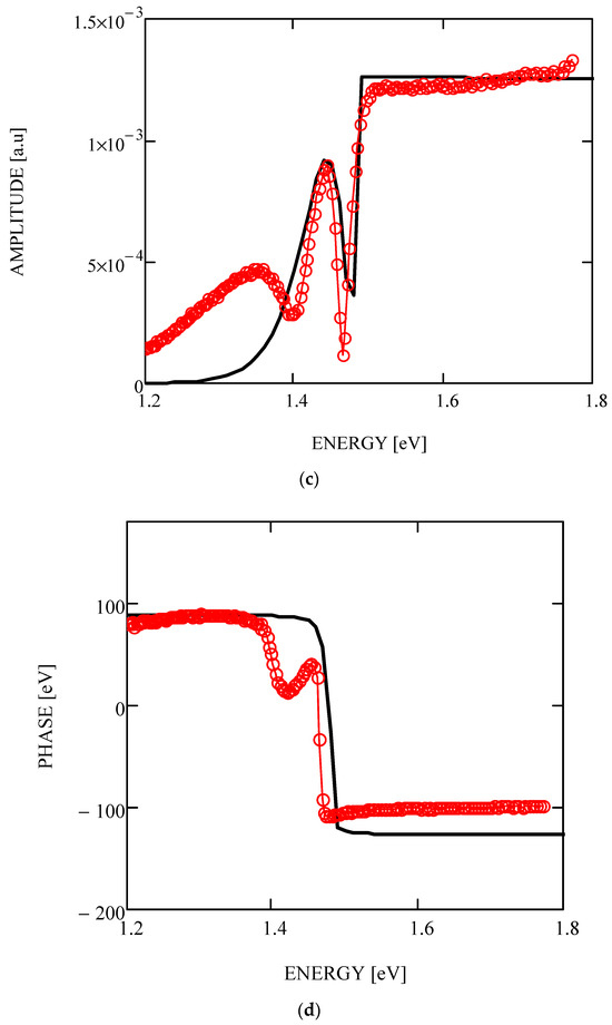 The following two maxima below the energy gap are visible in the amplitude spectrum: 1.35 eV and 1.43 eV. The intensity ratio for the maximum of 1.35 eV to the maximum of the signal above the gap is very similar. Still, it is worth noting that the maximum of 1.43 eV in the amplitude spectrum at the frequency of 12 Hz is small compared to the magnitude of the amplitude above Eg. This maximum is associated with an additional defect located on the surface, as evidenced by phase changes for the energy of 1.43 eV (Figure 5b). The fact that the defect is located on the surface is also evidenced by the fact that, for higher frequencies in the phase spectrum, a phase jump is observed between the values of −20 and −40, and for the 12 Hz value between −150 and −120. The nature of the signal source thus changes, from surface to bulk.