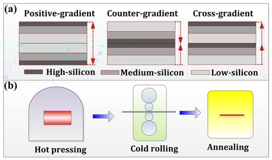 Schematic diagram of (a) stacking methods and (b) processing routes of different Si-gradient electrical steel composites.